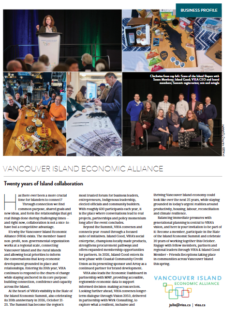 Balancing immediate pressures with generational planning is central to VIEA’s vision, and here is your invitation to be part of it: Become a member, participate in the State of the Island Economic Summit and celebrate 20 years of working together this October, and engage with fellow members, partners, and regional leaders through VIEA Member Receptions taking place in communities across Vancouver Island this spring.